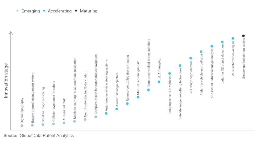 3D image segmentation, AV on-board control systems, and lidar for 3D object detection are some of the accelerating innovation areas, where adoption has been steadily increasing. Among maturing innovation areas is sensor-guided aiming assists, which is now well established in the industry.